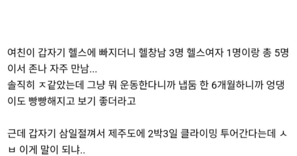 여친이 헬스 사람들하고 클라이밍 여행? 간다는데