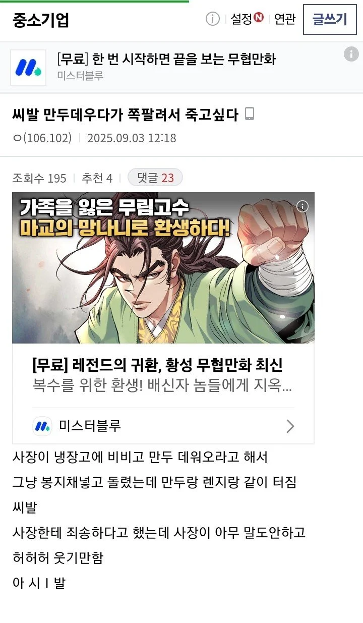 만두 때문에 쪽팔려 죽겠다는 중소기업갤러
