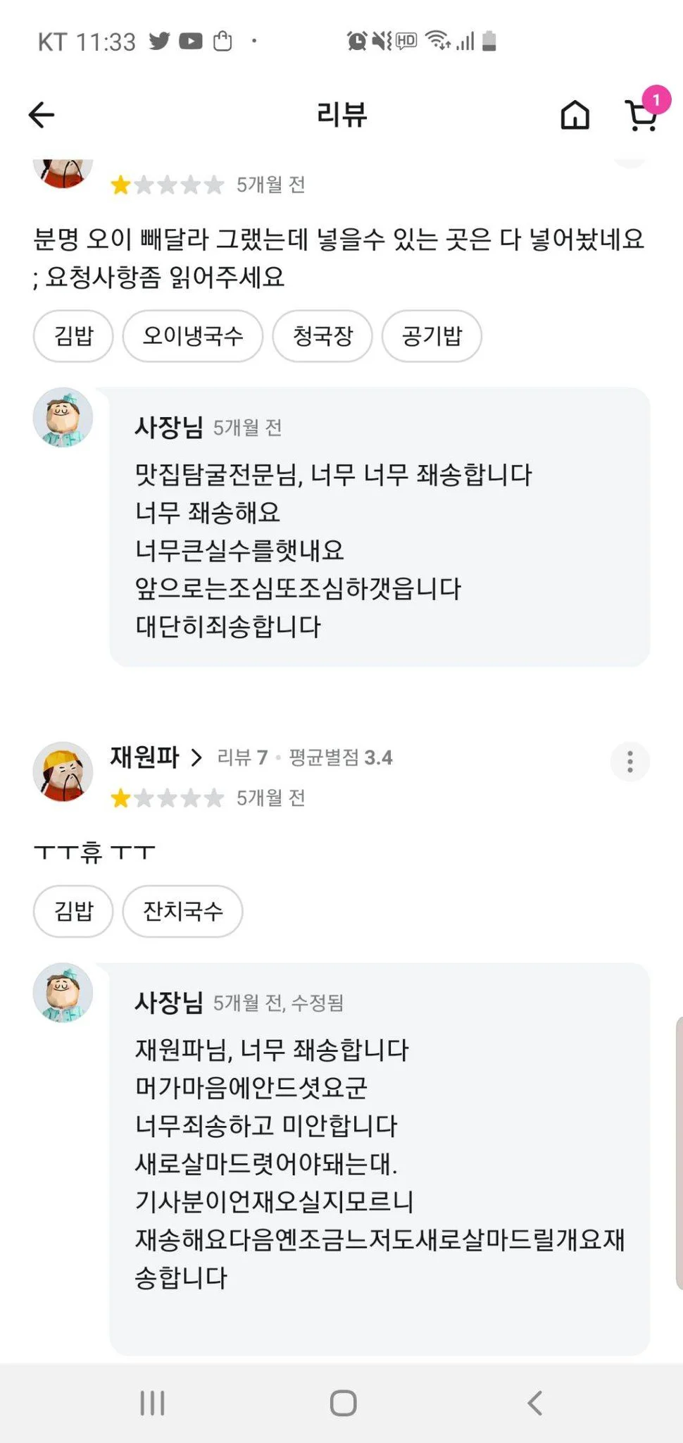 배민 리뷰보는데 사장님이 연세 있어 보여서 마음이 아픔